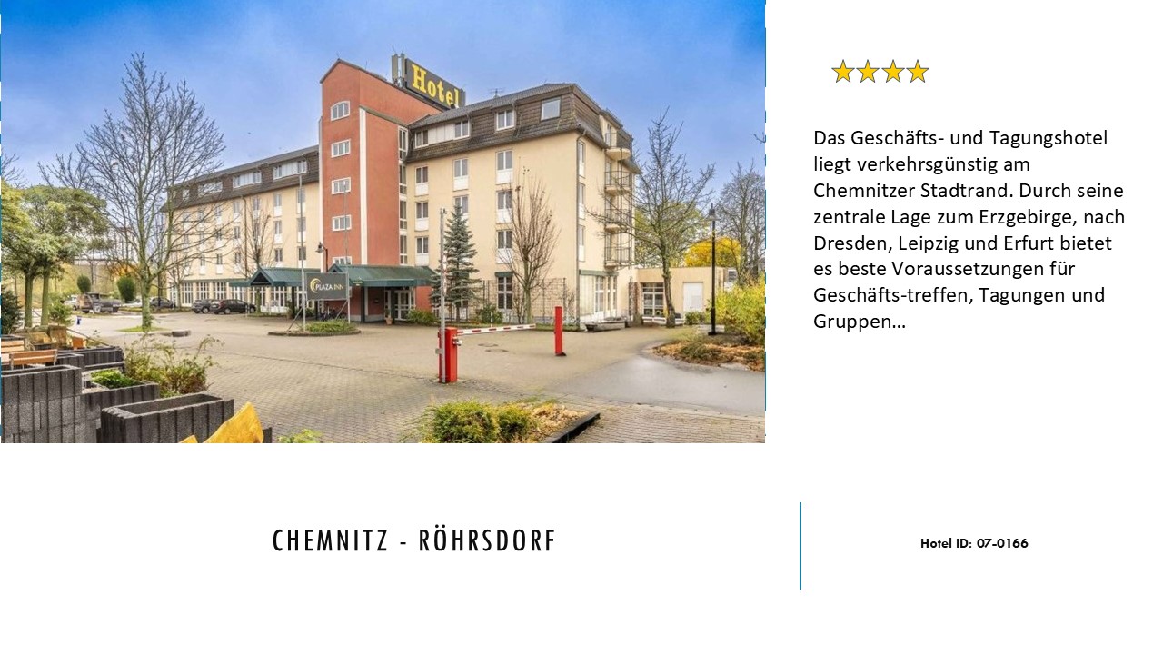 Das Geschäfts- und Tagungshotel liegt verkehrsgünstig am Chemnitzer Stadtrand. Durch seine zentrale Lage zum Erzgebirge, nach Dresden, Leipzig und Erfurt bietet es beste Voraussetzungen für Geschäftstreffen, Tagungen und Gruppen. Die 103 Zimmer sind sehr komfortabel eingerichtet. 5 ruhige gelegene Tagungsräume, mit WLAN, alle mit Tageslicht und verdunkelbar mit Kapazitäten bis 100 Personen stehen zur Verfügung.