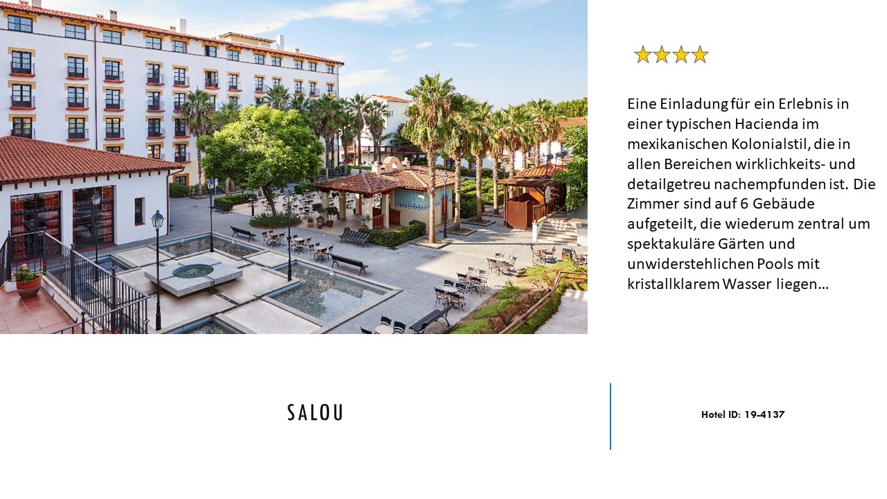Eine Einladung für ein Erlebnis in einer typischen Hacienda im mexikanischen Kolonialstil, die in allen Bereichen wirklichkeits- und detailgetreu nachempfunden ist. Die Zimmer sind auf 6 Gebäude aufgeteilt, die wiederum zentral um spektakuläre Gärten und unwiderstehlichen Pools mit kristallklarem Wasser liegen; in einem der Pools liegt ein versunkenes Piratenschiff, das den Kleinsten viel Vergnügen bereitet.