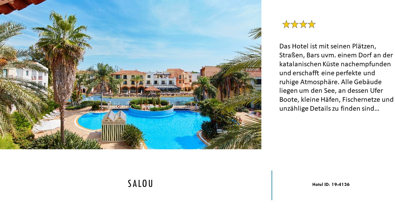 Das Hotel ist mit seinen Plätzen, Straßen, Bars uvm. einem Dorf an der katalanischen Küste nachempfunden und erschafft eine perfekte und ruhige Atmosphäre. Alle Gebäude liegen um den See, an dessen Ufer Boote, kleine Häfen, Fischernetze und unzählige Details zu finden sind.