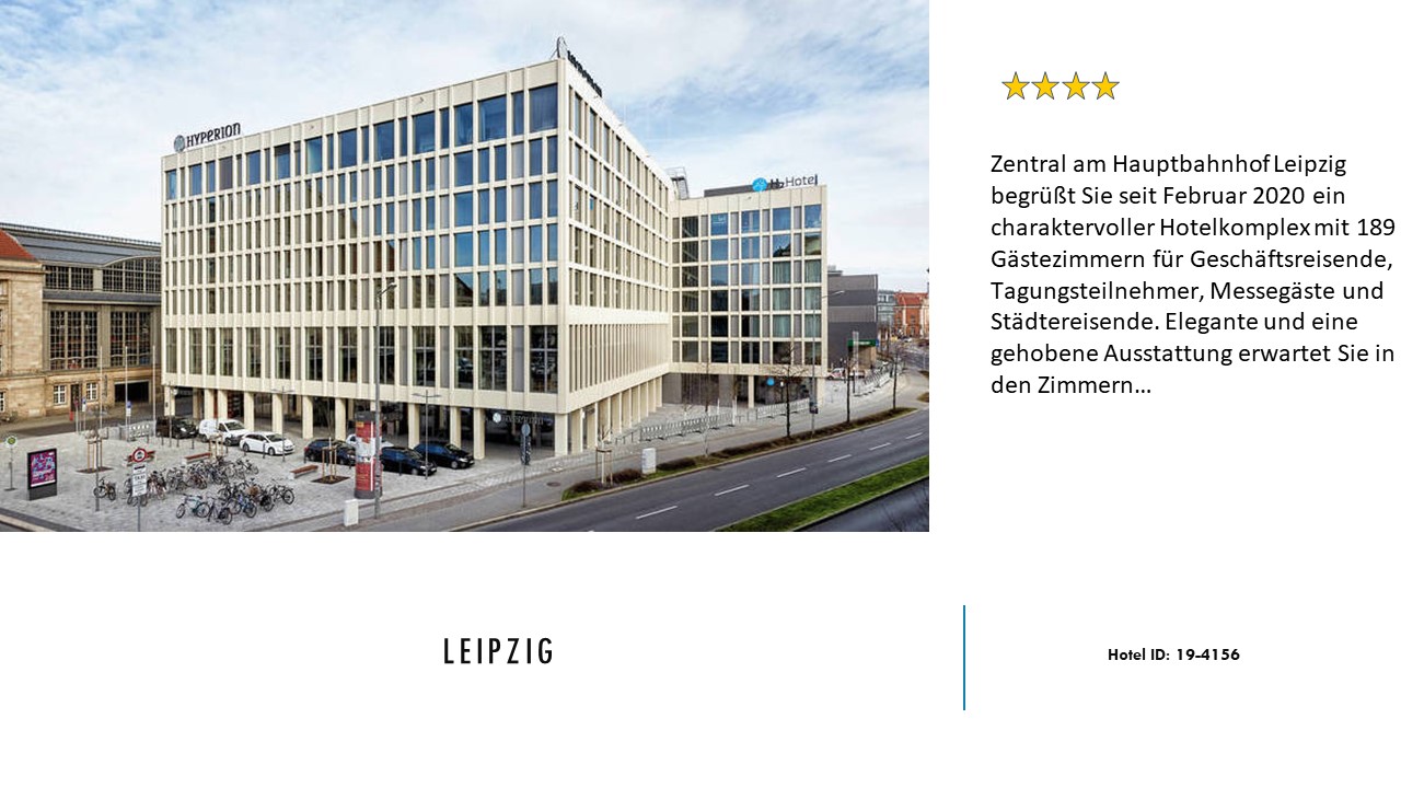 Zentral am Hauptbahnhof Leipzig begrüßt Sie seit Februar 2020 ein charaktervoller Hotelkomplex mit 189 Gästezimmern für Geschäftsreisende, Tagungsteilnehmer, Messegäste und Städtereisende. Elegante und eine gehobene Ausstattung erwartet Sie in den Zimmern. Im 1. Obergeschoss befinden sich 8 multifunktionale Konferenz- und Besprechungsräume mit viel Tageslicht und modernster Konferenztechnik.
