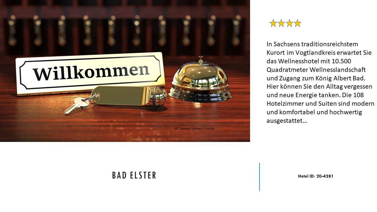 In Sachsens traditionsreichstem Kurort im Vogtlandkreis erwartet Sie das Wellnesshotel mit 10.500 Quadratmeter Wellnesslandschaft und Zugang zum König Albert Bad. Hier können Sie den Alltag vergessen und neue Energie tanken. Die 108 Hotelzimmer und Suiten sind modern und komfortabel und hochwertig ausgestattet. Tagungsgäste finden hier vielfältige Freizeit- und Entspannungsmöglichkeiten. Alle drei Veranstaltungsräume sind durch Verbindungstüren können miteinander verbunden werden, bzw. sind durch Verbindungstüren schalldicht trennbar.